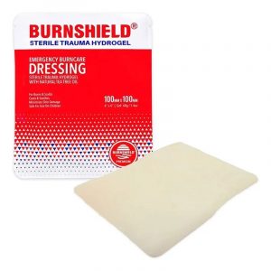 A compact Burnshield Small Surface Dressing: 10cm x 10cm hydrogel-infused pad, perfect for effective treatment of small area burns.
